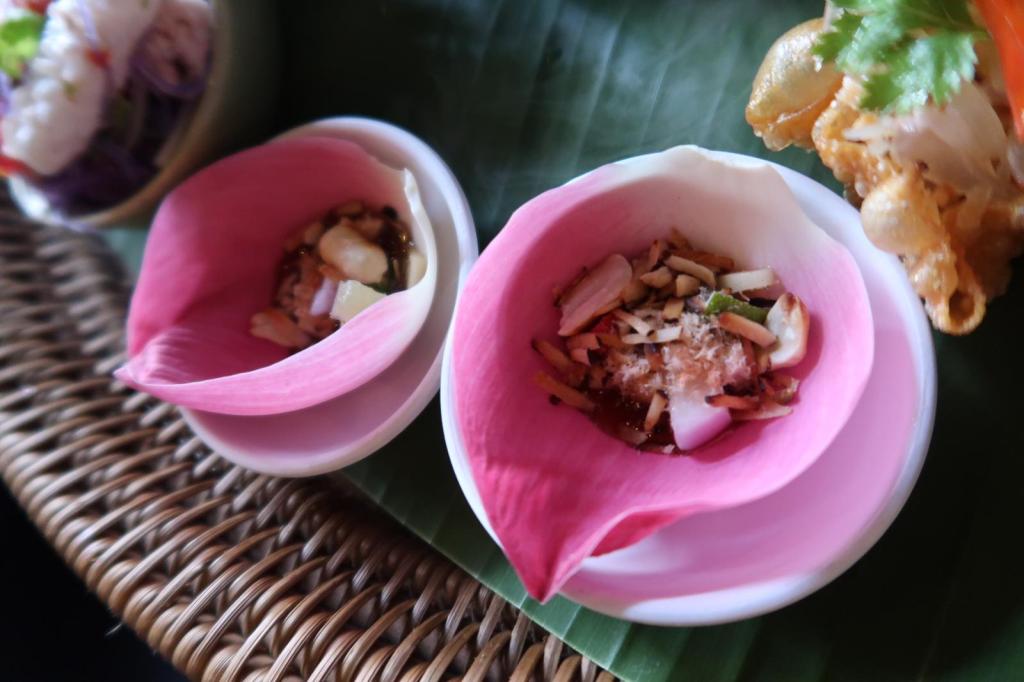 泰北傳統菜式,甜酸苦辣並存,蓮花帶微微的苦澀配合乾椰子絲,花生,青檸檬,薑,辣椒及椰子糖醬,很美味。(怕辣的可將辣椒減走,但至少留下一小粒保存甜酸苦辣的特色)